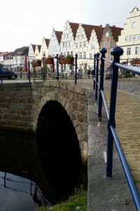 På en banke i marsken mellem Trene og Ejderen, og bare en times kørsel fra grænsen, ligger Frederiksstad – Friedrichstadt på tysk, men det er trods alt gammelt dansk land, så vi kan godt bruge det danske navn.