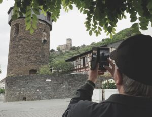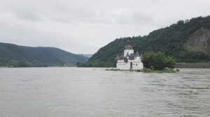 Derimod kan man – normalt – komme ud og se burg Pfalzgrafenstein, der ligger på en lillebitte ø i Rhinen lige ud for Kaub. Det er et tidligere toldsted, hvor forbipasserende skibe har skullet betale for at få lov at passere, og borgen er stort set uændret siden den blev bygget i 1300-tallet. Vi kom dog ikke derud, for øen var oversvømmet, da vi var der.