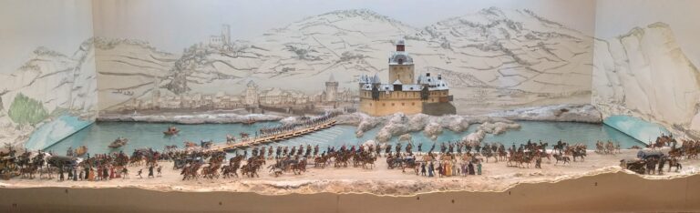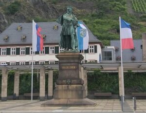 - Kaubs stolthed er krigshelten, feldmarskal Blücher, og der er både statue og museum til minde om dengang, lige efter nytår 1814, da en armé under Blücher samledes ved Kaub, hvor de byggede en pontonbro, så soldaterne kunne krydse Rhinen og marchere mod Frankrig og Napoleons hær.