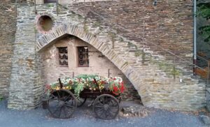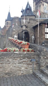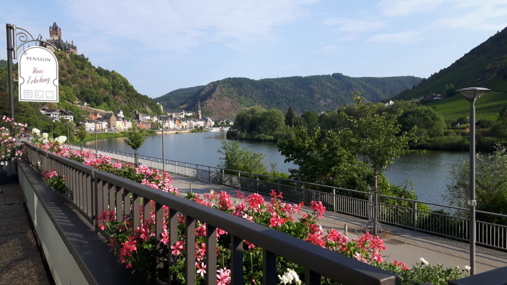 Hver morgen spiste vi på pensionatets morgenmadsterrasse med udsigt over Mosel, vinbjerge, Cochem by og slottet, Reichsburg Cochem, der daterer sig tilbage til 1100. Slottet blev jævnet med jorden i slutningen af 1600-tallet (den pfalsiske arvefølgekrig) og henlå som ruin indtil en rigmand købte og genopbyggede det 200 år senere. I dag tilhører det byen, og er åbent for besøgende. Vi så det kun udefra, men hold op, hvor vi nødt synet – og ikke mindst udsigten over Mosel.