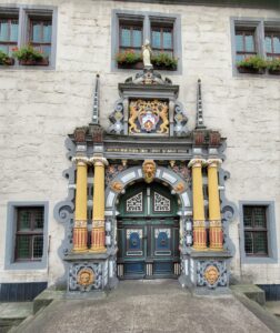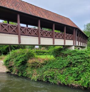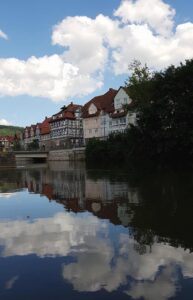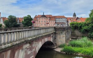 Vi ledte efter et sted at drikke kaffe, og byen vrimler med hyggelige cafér, men de fleste var coronalukket, og dem, der holdt åbent, var så overrendt, at det ikke var til at finde en plads. Så vi trissede videre gennem byen, fra Fulda til Werra og kiggede på gammel bymur og bydelen, der rejser sig dekorativt på den anden side af floden og den smukke gamle bro. Det var et underskønt område, og vi sad længe og dasede.