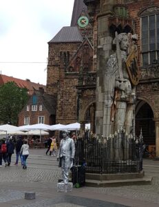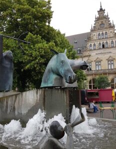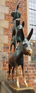 Fire skikkelser, der går igen hist og pist og alle vegne i Bremen: Bremer Stadtmusikanten fra brødrenes Grimm gamle eventyr af samme navn. Hvis du ikke kender historien i forvejen, kan du høre den i en “pixi-lydbogs-udgave” her. På letfatteligt tysk.