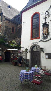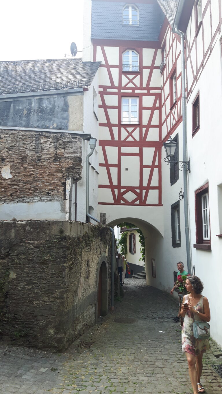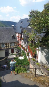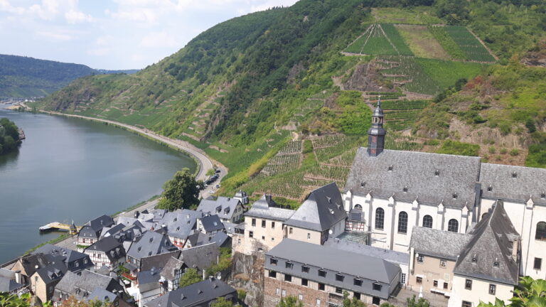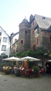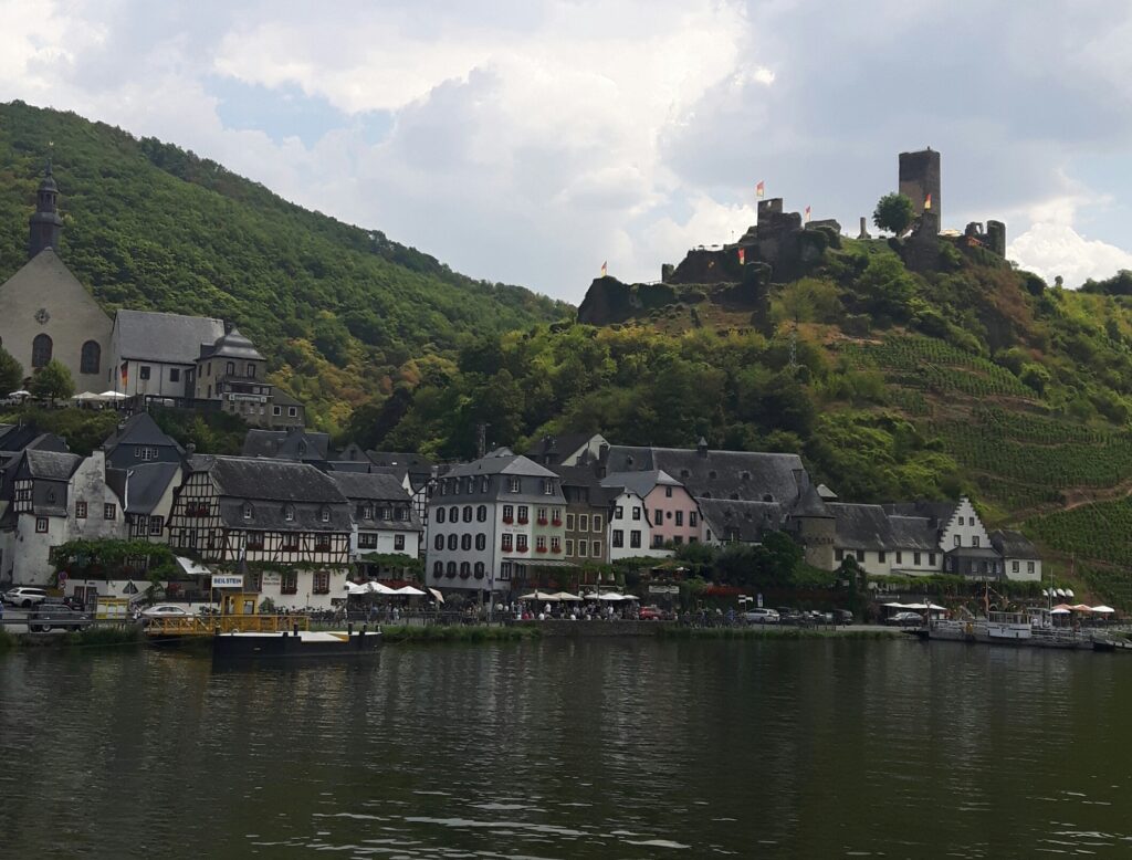 Vi tog færgen fra Cochem en steghed sommerdag.Trodsede den bagende sol – termometret nærmede sig allerede om formiddagen 40 grader – og gik op på øverste dæk for at kunne nyde udsigten mest muligt. Turen mellem de grønne vinmarker er så smuk, at man ikke kan lade være med at fotografere i vildskab. Og så brændte min mobil sammen! Her var jeg på en af de smukkeste udflugter nogen sinde, og så kunne jeg ikke tage billeder!! Jeg var ved at dø af ærgrelse. Det lykkedes mig ind i mellem at narre min mands mobil fra ham, men ikke nok. Slet ikke nok!