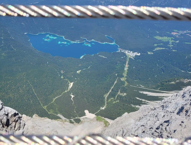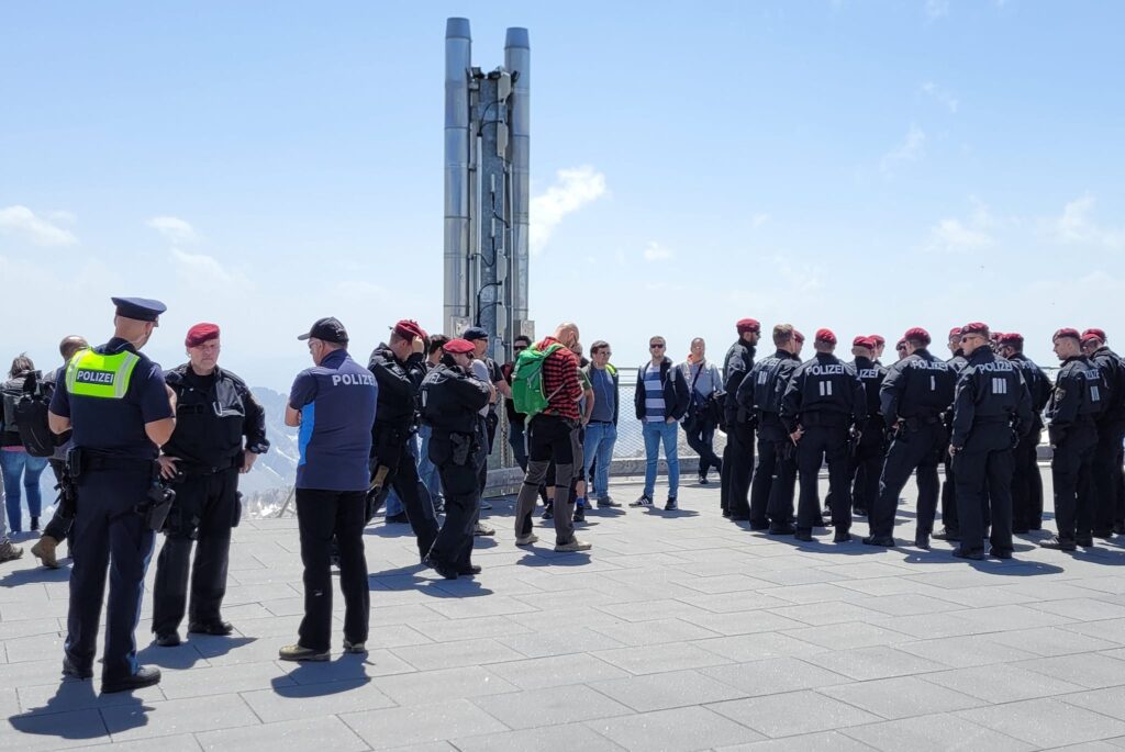 Vejret i alperne er ustabilt, og vejrudsigten var ikke lovende. Men mens vi stod og svedte sammen med politiet, var vejret flot og klart, så vi bestemte os impulsivt for at tage på Zugspitze, før vi tjekkede ind i vores ferielejlighed. Man vil jo gerne kunne se noget, når man bruger en mindre formue på at komme op på Tysklands højeste alpetop. Det kunne vi også: Hundredevis af bjergtinder så langt øjet rakte – og lige så mange politifolk og jægersoldater. Men i det mindste havde de ikke lukket Zugspitze-banen ned, og oplevelsen var fuldstændig fantastisk.