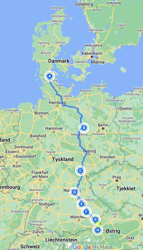 Vi starter i Tangermünde, kører videre til Essing ved Donau og skal ende i Berchtesgadener Land. Jeg har markeret nogle stoppunkter på køreturene. Det er steder, vi gerne vil se – hvis tiden og trafikken tillader det.