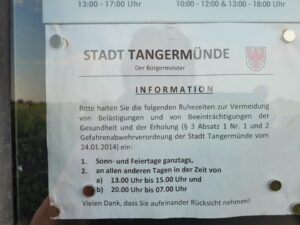 I “Gefahrenabwehrverordnung” for Tangermünde kan du nærstudere byens sikkerhedsbestemmelser (på tysk). Støjreglerne står i paragraf 3.