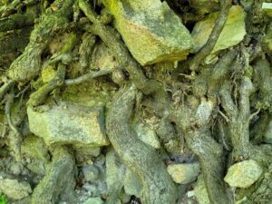 Vi ræsonnerede os frem til, at træet har stået på en bunke murbrokker fra den gamle borg, som man siden har fjernet i forbindelse med en restaurering eller måske snarere en oprydning. Der er nogle mure, der er blevet restaureret, men det meste er meget ruineret. Det er træet, der er spektakulært. Det er et vildt syn!