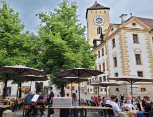 Kald mig bare barnlig, men når vi spiser i en by, der hedder noget med …burg, skal vi altså have en burger. I dette tilfælde en Regensburger. Den var god! Men det trak op til uvejr, og midtbyen tømtes for mennesker på rekordtid. Det resulterede vist desværre også i, at vi huggede maden i os i en fart og skyndte os tilbage mod bilen. Den smukke by studerede vi ikke nær så grundigt, som vi burde. Men den er smuk – den kan bestemt anbefales.