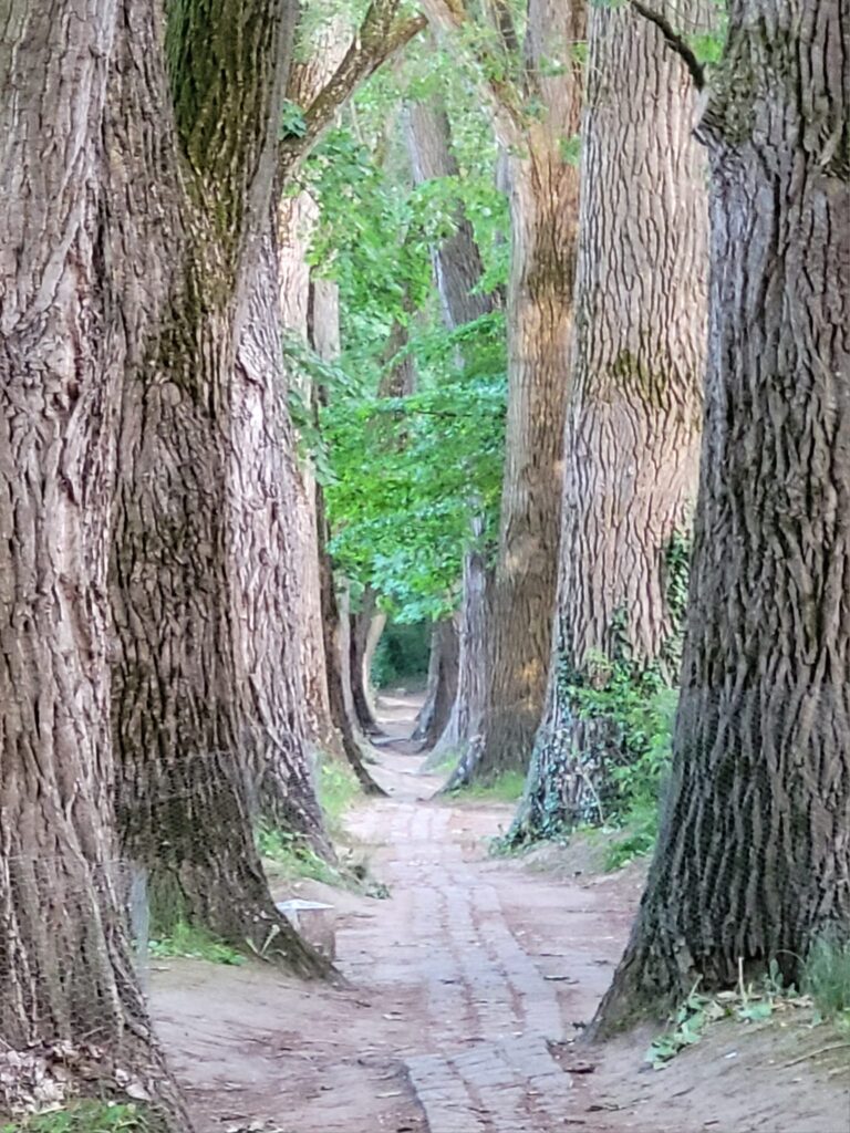 Poppeltræerne er enorme. Et par meter i omkreds, vil jeg tro, så de må være gamle. Man kommer uvægerligt til at spekulere over, om den, der plantede træerne, skabte “mønstret” md overlæg, eller om magien bare opstod med tiden. Flot er det i hvert fald. Enormt flot.