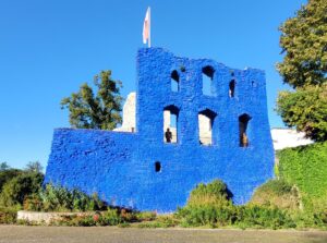 Den grimme blå maling er – eller var – et led i klimakampagnen Aqua Viva, der i august og september 2023 satte fokus på vandet som kilde til liv. Det havde vi bare ikke hørt om, da vi besøgte byen i slutningen af september og fik et mindre chok ved synet af den stakkels borgruin.