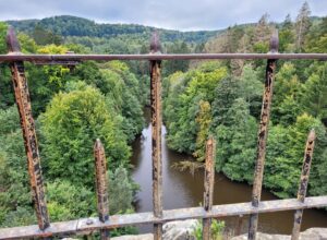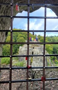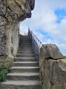 Men hun kom helt til vejrs på begge klipper, og også over trappen. Det var hårdt, men ikke så skræmmende som forventet, selv om hun havde brug for nogle små hvil på vejen op. Broens planker ser lidt mølædte ud, men i det mindste kan man ikke se ned igennem dem. Broen var ikke så uhyggelig, da hun først stod deroppe.