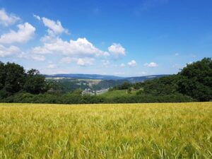 Bag de dramatiske klipper, der rejser sig stejlt over Rhinen, er der bølgende kornmarker og skove.