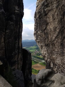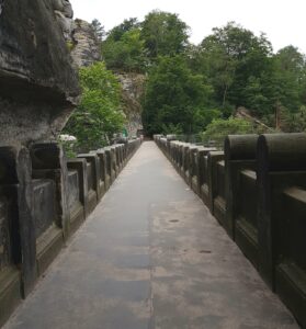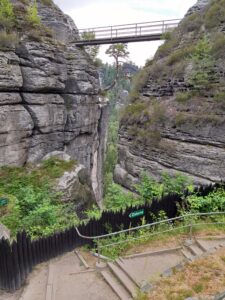 Hvis man har lidt (eller meget) højdeskræk kan man gå over den 76,5 meter lange bro, og gyse over, hvor langt ned, der er, både til foden af broen og til Elben, der flyder forbi 200 meter længere nede, og som kan ses gennem klippespalterne.