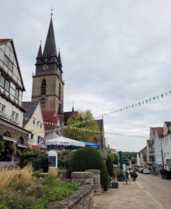 Vi valgte den, fordi vi fandt et nysseligt lille pensionat i udkanten af byen, og det ligger tæt på Teutoburger Wald og Externsteine i den del af de tyske mittelgebirge, der hedder Eggegebirge – et meget kuperet landskab med skov på alle sider af byen, og en sand velsignelse af gode vandrestier.