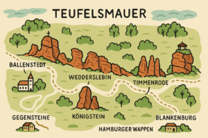 Harzens Teufelsmauer, hvis flotteste partier strækker sig fra Ballenstedt i øst til Blankenburg i vest, er ingen undtagelse.