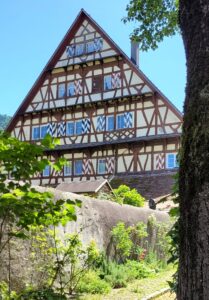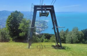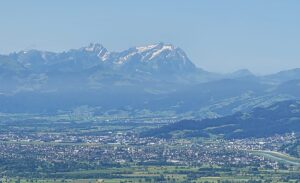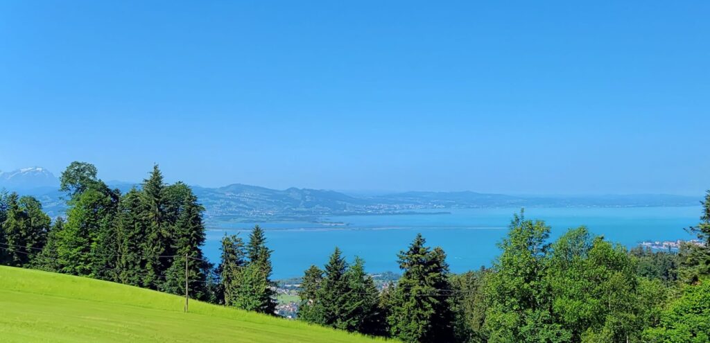 Men der er da en vandrer-p-plads deroppe, og derfra er der kun en lille kilometer at gå til bjergstationen, hvorfra der er yderligere en lille travetur op til bjergtoppen, Gipfelkreuz, i godt 1000 meters højde. Udsigten deroppe er mageløs: Alpetoppe i massevis til den ene side og til den anden: Hele Bodensøen i al sin tindrende blå pragt.
