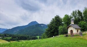 Lidt højere oppe ad bjerget er der i øvrigt et fint geheimtipp i form af et skønt udsigtspunkt. Vi sad på vores balkon og undrede os over, at der hele tiden kom mennesker ud på marken over os, og til sidst gik vi derop. Der lå et  lille kapel med overdådig udsigt over bjergene og byen: Kirchleitnkapelle. En af vandreruterne i området går åbenbart den vej forbi.