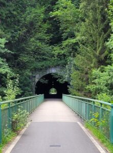 Det var lidt tilfældigt, hvor vi var ude at gå. En dag traskede vi en tur langs vandløbet Zwickauer Mulde, hvor en vandre- og cykelrute nord for landsbyen Bockau går gennem en gammel jernbanetunnel, hvor skinnerne er erstattet med asfalt. Det var da meget sjovt!